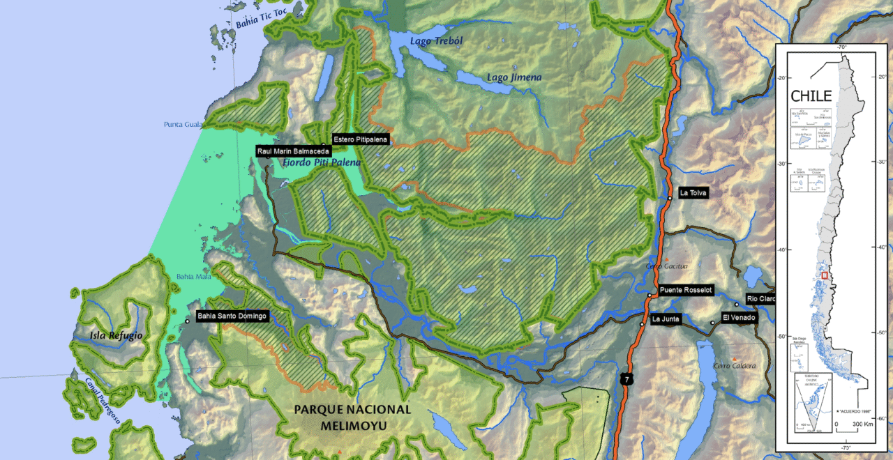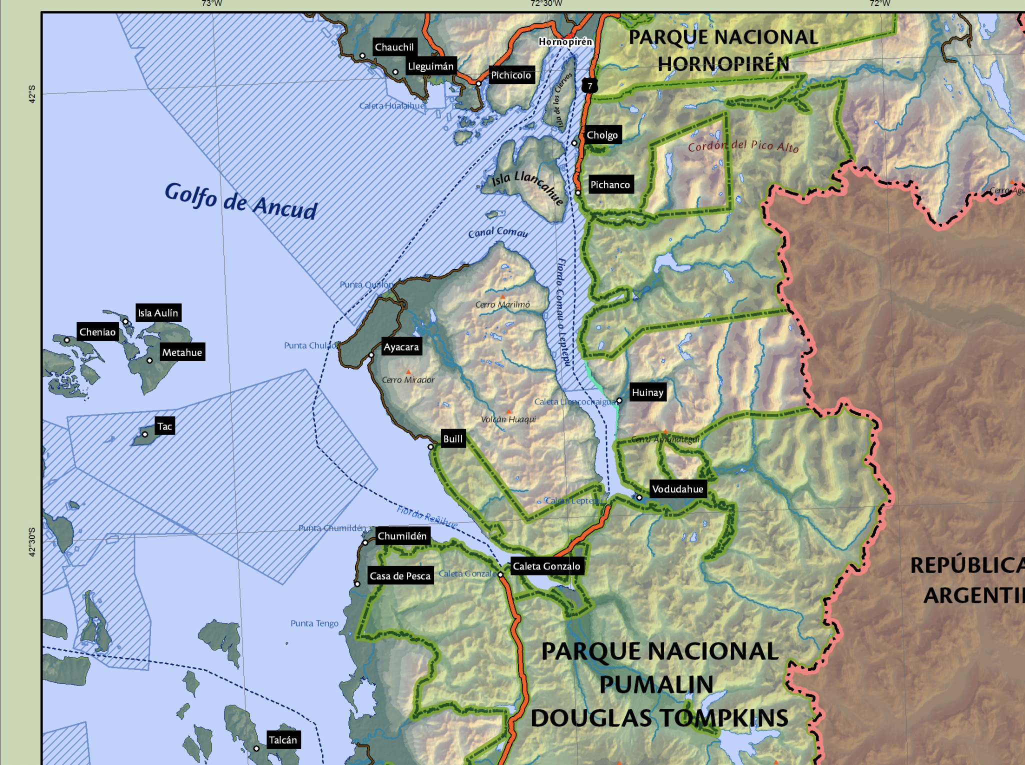 Cartography of the 17 national parks of the Chilean Patagonia, mapping their connections to other parks, nearby marine protected areas, and surrounding communities.